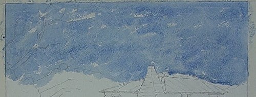 The under-painting for the walls is a light blue-grey mix. This wall is not completely in the sun. The other wall in the shade is just a darker blue-grey. Plot the other shadows and we will come back to them later.