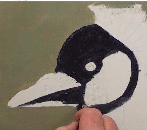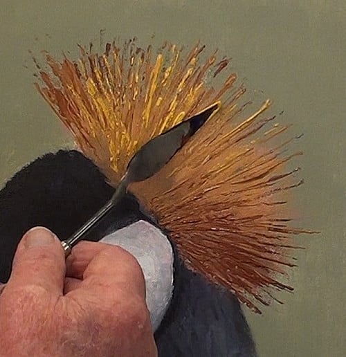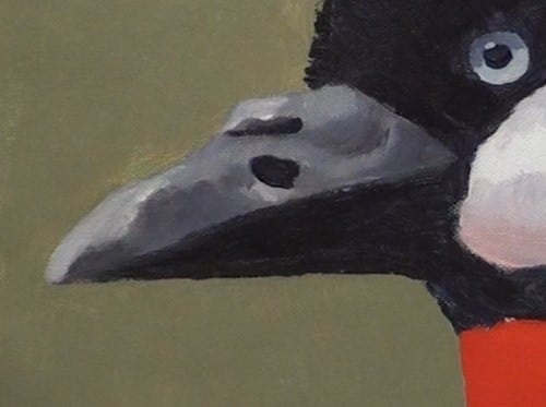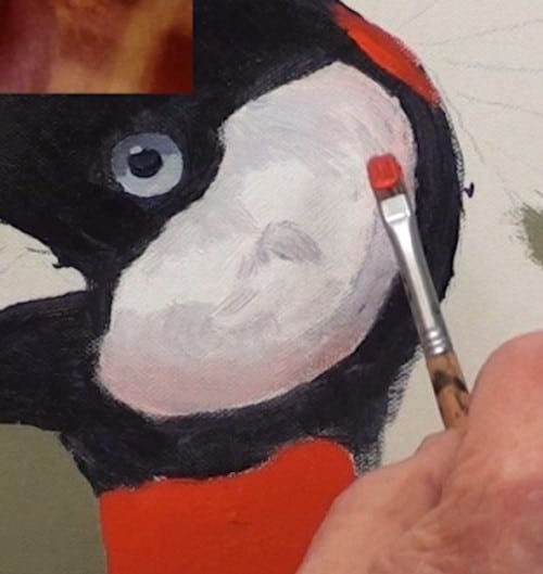 Add White paint to the cheek area and Cadmium Red to the throat, as well as a small section just under the crown. White always reflects its surroundings and we now need to show that the cheek is not flat but has a rounded shape to it.