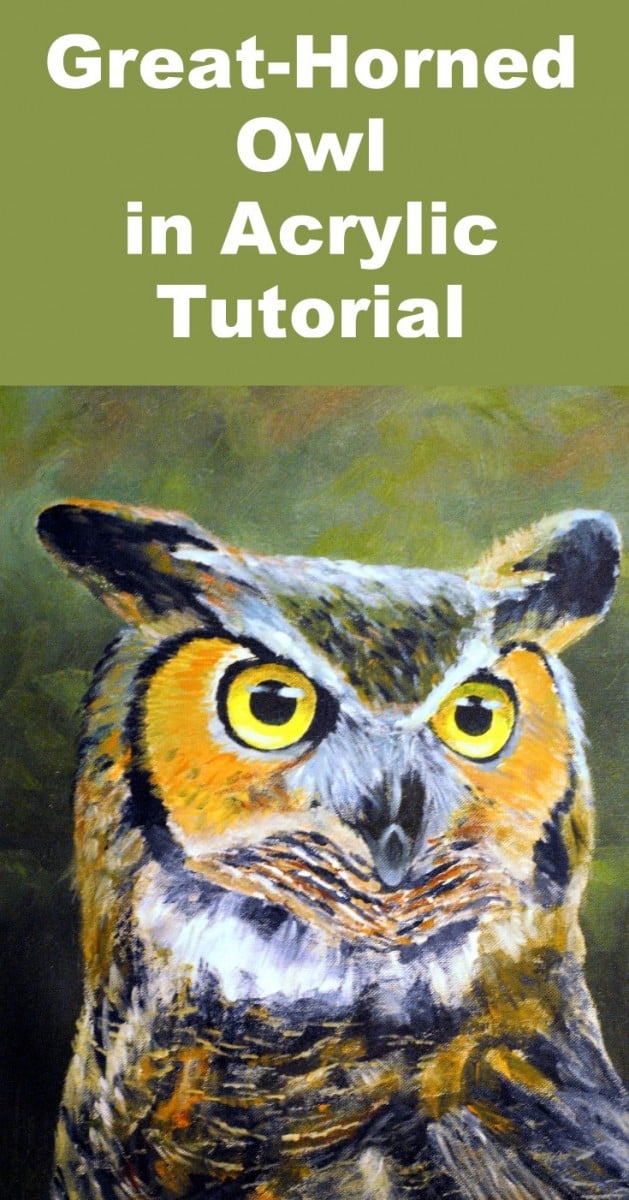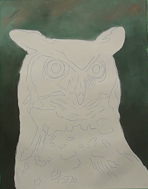 In order for the owl to stand out, mix a very dark green from Viridian and Burnt Sienna and carefully paint around the outline of the image. Make it slightly lighter near the top for interest.