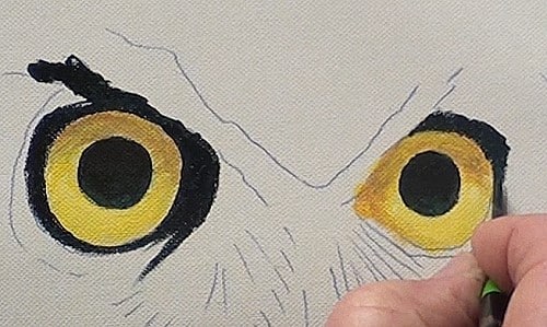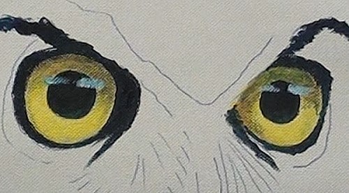 Paint the irises with a light yellow and then with a very dark mix, paint the pupils. To show the translucency of the eye, lighten the lower part of the iris with White. Because of the overhanging eyebrows, add the shadow on the eye with some Yellow Ochre. The iris is not yellow enough so brighten it up with a mix of Yellow and White. With the same dark mix as the pupil begin to paint in the dark areas around the eyes. Now we can see we need to darken up the shadows on the eyes even some more.