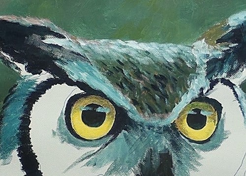 The wing area is painted with some of the blue/black mix and white to bring out the gray color on the wing. The body is actually side on and the owl has its head twisted towards us.