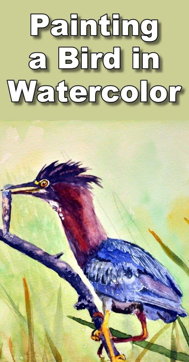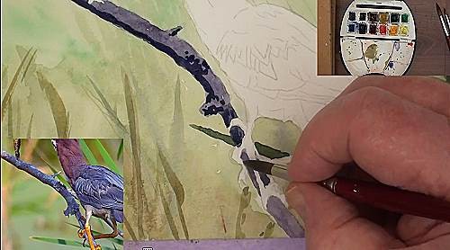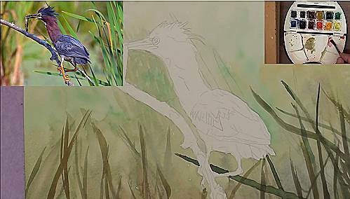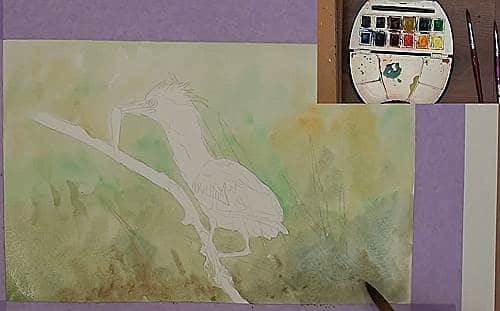 Carefully wet the area around the twig and the Heron. Then float in a light Yellow/Green colour for the background. While it is still wet drop in some bright Green and some Yellow Ochre and let them merge. Continue doing this until the lower half is also completed. The lower half will be slightly darker. While it's still damp flick in some of the reeds. They must not be too dark or sharply defined as they are in the distance. You can also lift out some of the lighter leaves.