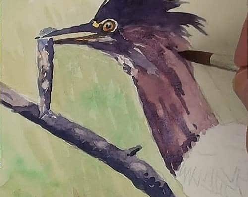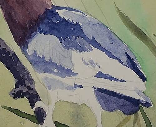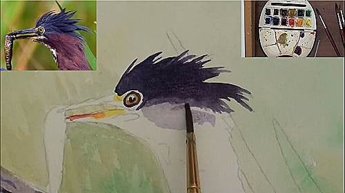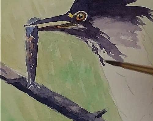 The eye is a Yellow colour and a touch of Orange around the outer edge. Add the Black pupil and leave a portion out for the glint of the eye. Be careful in not making it too small. Add the lighter colours on the beak and proceed with the head in a very dark Blue/Black mix of Ultramarine and Burnt Sienna. Notice how the crest feathers have been flicked outwards. Lighten the lower half with water.