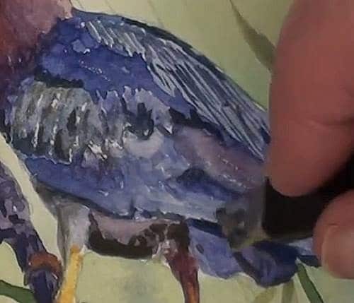 With some light Cobalt Blue paint the lighter portions of the feathers. Add the darker Blue/Purple shadows. I forgot to mask in the thin light lines for the edge of the wing feathers and I got lost here, and had to improvise and guess by going very impressionistic with the dark outlines. Fill in the rest of the wing colour and touch in some Red where needed. Dry the wing and lift out some highlights.