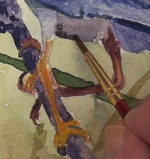 Mix up a Mauve/Purple with Cobalt Blue and Cadmium Red and paint the twig. Lift out a few of the lighter markings and then paint the shadows with a much darker mix of the same colour. Shadow the twig and add the dark markings.