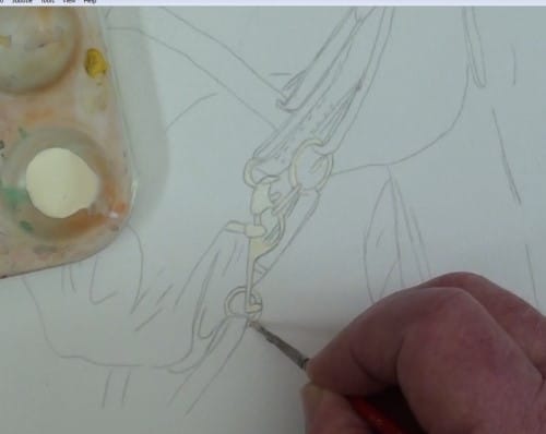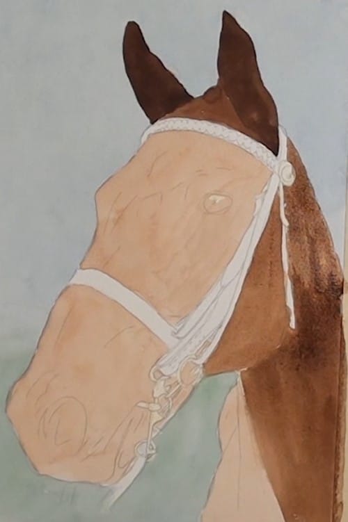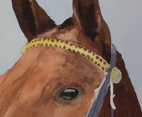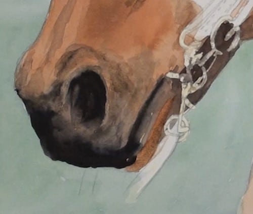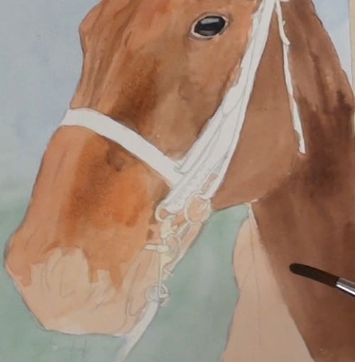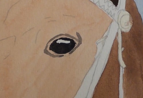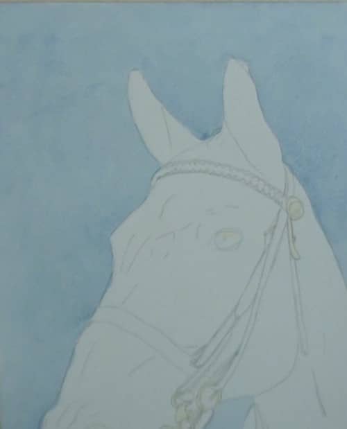 Apply the masking fluid to all the areas where the white of the paper is to be preserved. Take particular care around the bit area. Don’t forget to mask in the eyelash area of the eye.