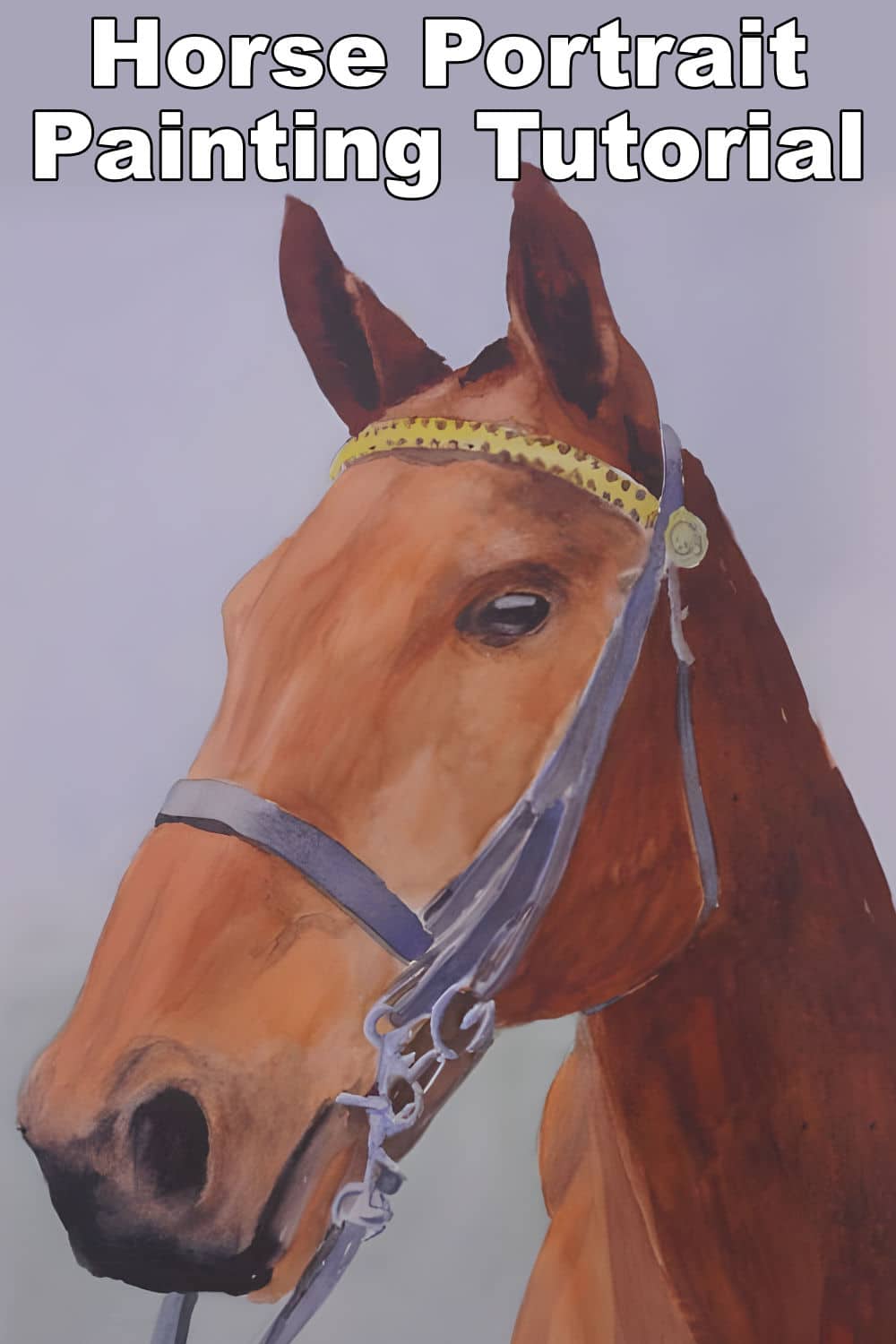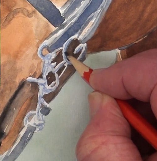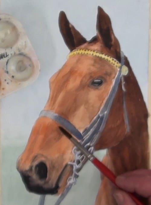 Begin blocking in the bridle with a blue/grey mix. Notice the thin white area that has been left for highlight of the strap edge.