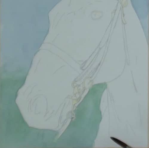 With a light blue colour wash in the sky, being careful around the profile of the horse. Look at the test colours on the outside of the painting area. It is always good to test your colours before applying them to the actual painting. A wrong colour or tone may be difficult to lift out if wrongly applied.