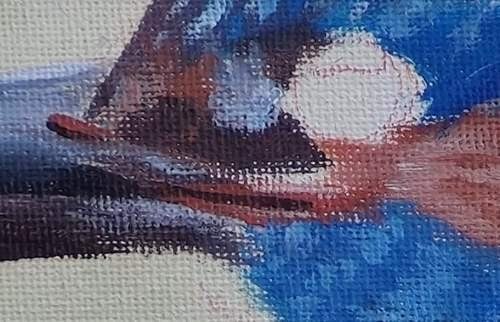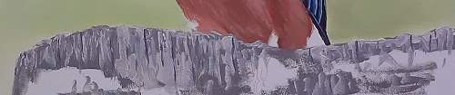 The tip of the wing is blocked in with a very dark purple, dried, then the feathers painted with blue, making sure to not lose the dark line between each feather.