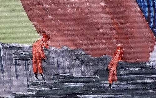 Block the feet in with orange and add shadows with crimson. Highlight by adding white to the orange. The nails and cast shadow are added using black.