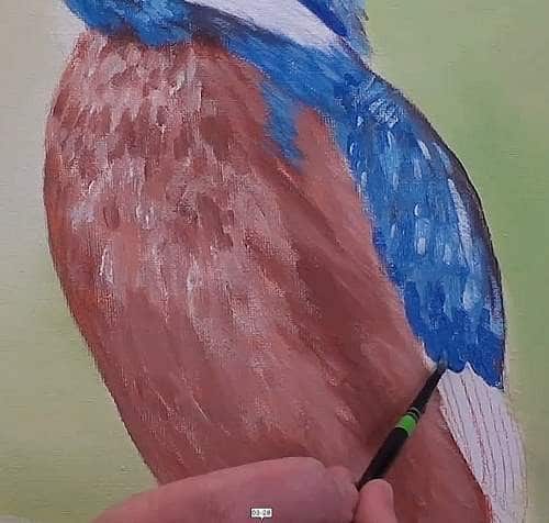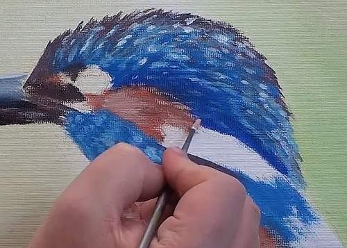We have one more patch to paint before the kingfisher can fly away. Block in his billy goat with white and add a few grey stripes to suggest detail.