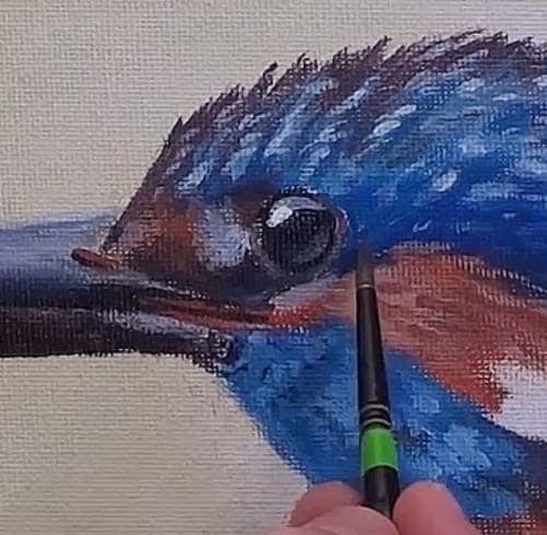 Now start blocking in the blue areas of the head using cerulean. Use the same purple from the beak to block in the dark areas on the head. Add white to the cerulean and start adding detail to the feathers on the head.