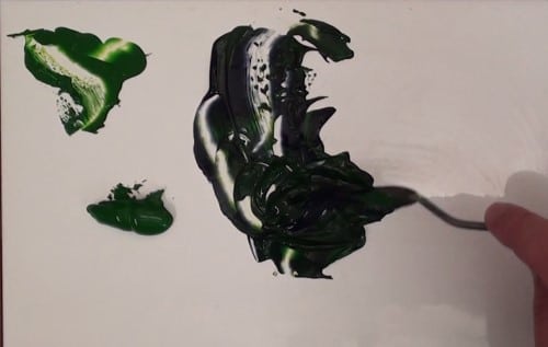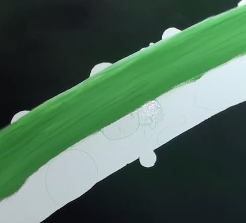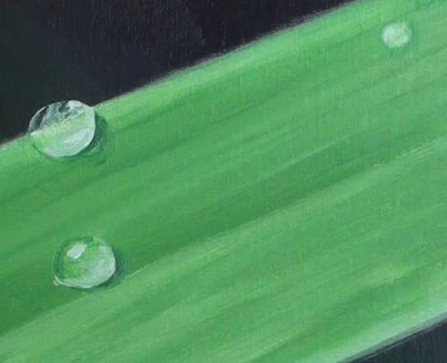Begin by wiping off some of the paint in the area of each water drop. (Or allow it to dry first, then proceed with the same steps.) Mix up a thin sky colour (or any other reflected colours); then apply it lightly to the drop area. Lightly circle it with the leaf (or background) colour, making it darker on the shadowed side. Add the reflected highlight, shaping it to the contour of the drop.