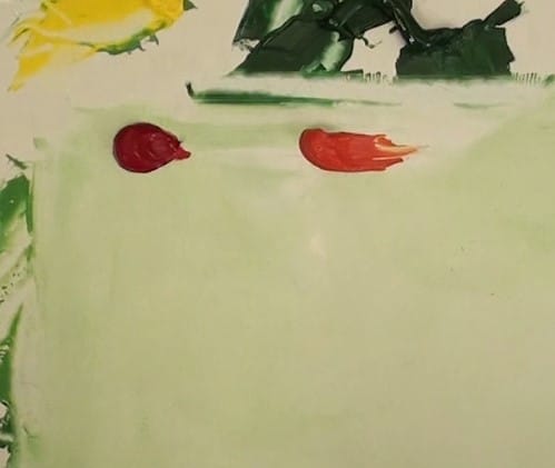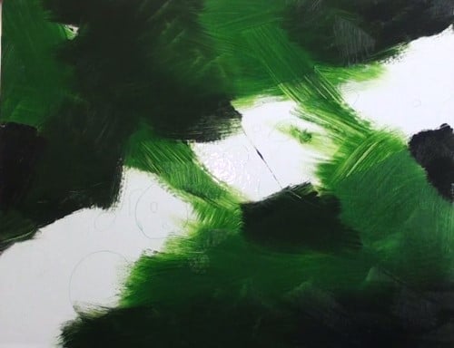 Add a bit of reflected leaf colour to the bug's eyes. Lighten that colour even more and add it to the large white patches behind the eyes. Paint the white triangular shapes behind the head, adding a bit of yellow as the line fades away. Then put just a bit of shadow beyond that.
