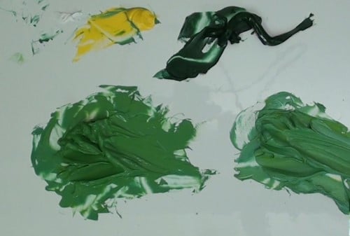 Use sky colour to make the contoured highlights at the top of the head. Highlights to the sides will have more of a leaf colour. Use the sky colour again to highlight the white line between the top of the head and the face. Continue the highlights down the face. Add highlight to the triangular shape at the side of the mouth. Add any other highlights as needed.