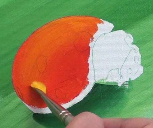 Before removing the mask, determine where to paint the ladybug's shadow. Clear away some of the paint from that area, then paint on the shadow. Be sure to make it dark close to the body, then gradually fade it out.