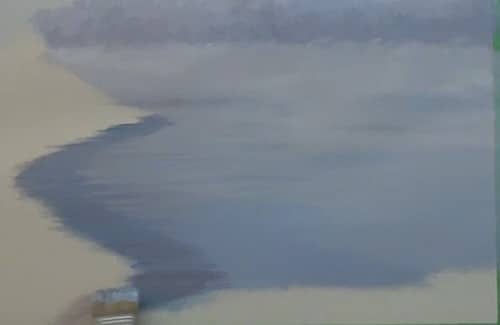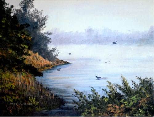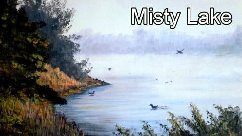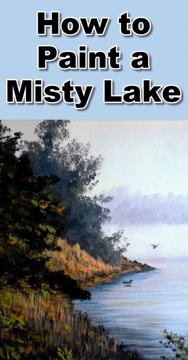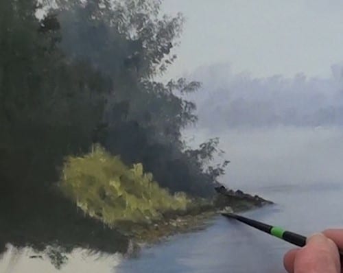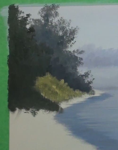 The color of the lake is a slightly darker shade than the sky. There is some light mist on the water surface so paint this effect where the tree line meet the waters edge.