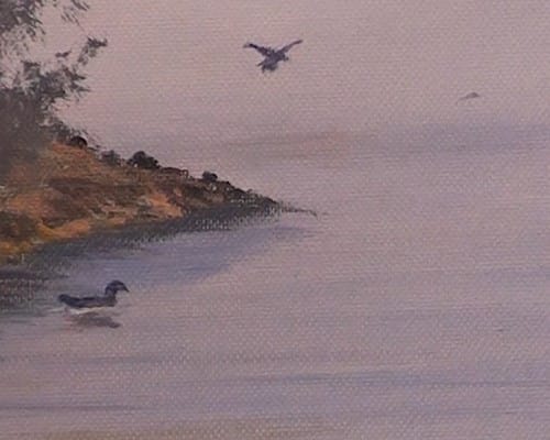 Paint a few more ripples to the water and block, in silhouette, the duck on the water plus its reflection. Add in the other duck as well as a few in the distance.