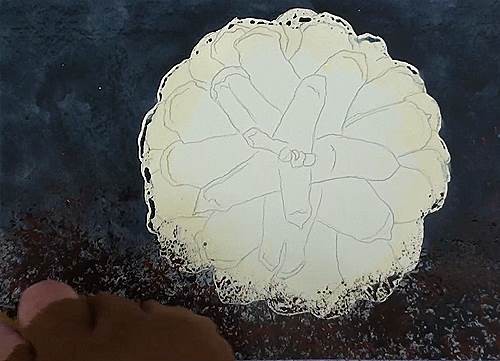 With a sponge, begin dabbing it to create texture. While it is still slightly damp pick up some yellow with the sponge and dab it into the dark mix. It will create a darkish green.. Dry thoroughly and remove the masking fluid.