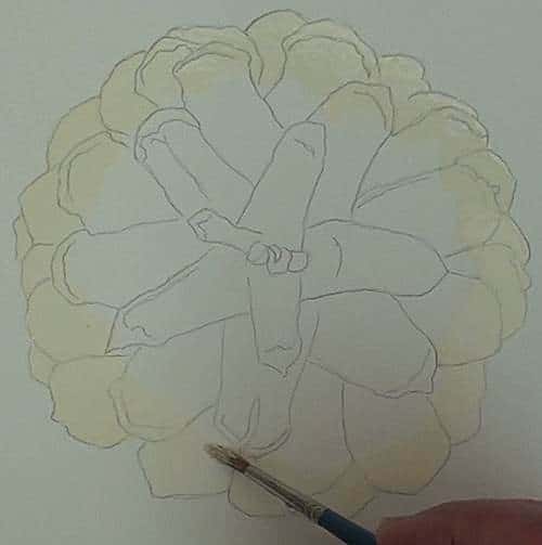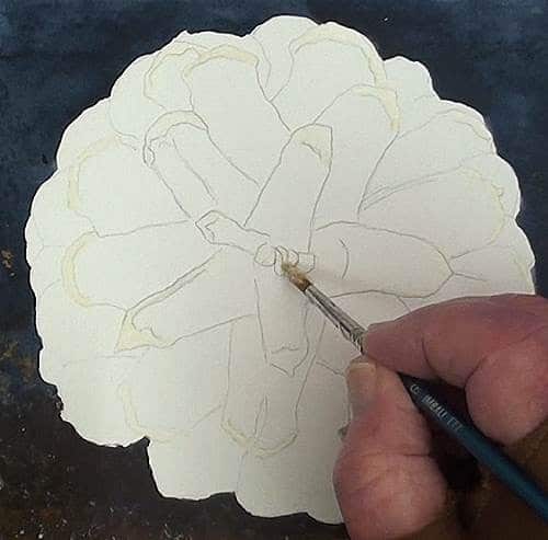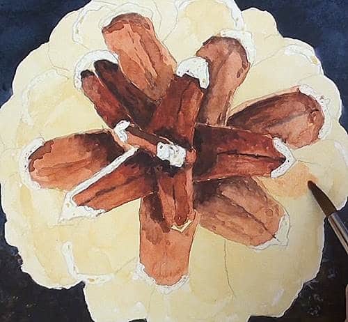 We now need to protect the very light areas within the cone with masking fluid. When you have done that and the masking fluid is dry, we can now paint in a light Yellow undercoat. Dry it with a hairdryer.