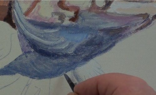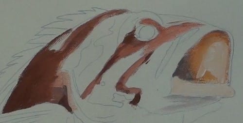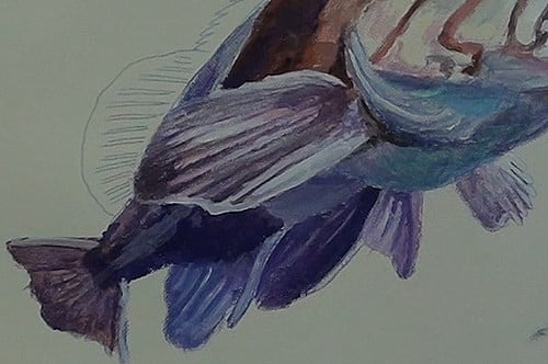 The fins are painted in with some purple. This is from some of the Blue-Grey mix into which Alizarin Crimson had been added. The belly is also painted with this mix. Vary the tonal ranges in order for the different sections to be visible and stand out from each other.