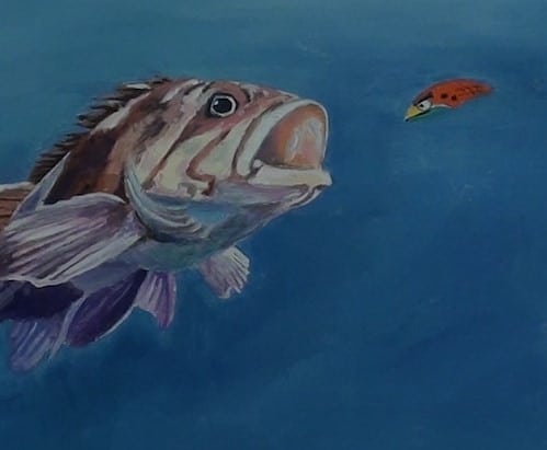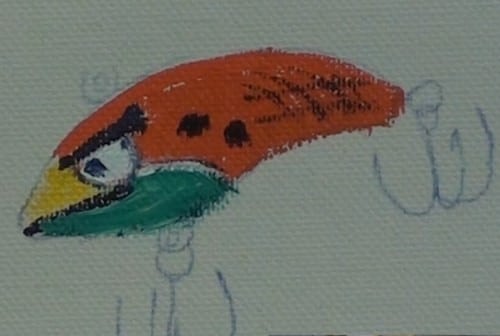 Just to bring a story and some drama into this painting, I have added this lure. I specifically chose one that had an arrogant look to it – a look that says, “I'm going to catch you.” The red and green colors enhances this atmosphere. The hooks we will add later.