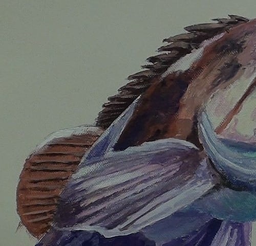 The mix for these fins is from Burnt Sienna to which some Ultramarine Blue has been added to give it the brownish color. Just add more Blue into the mix for the darker ribs. Use some White to paint in the subtle highlights on these ribs.