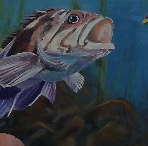 The bass has darted from his hiding place, so we need to show this. Start off by plotting the tall weeds in lightly at first. Once you are satisfied with them, you can begin adding some very dark Green for the bottom vegetation. This shows up the fish even further.