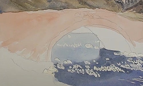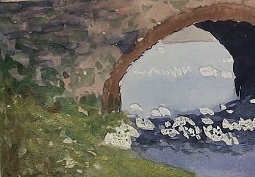 With Burnt Sienna and a touch of blue, begin painting the side of the bridge. Paint the banks a light green and show the waterline of the distant hill through the bridge hoop. With some lighter color begin to paint in some texture on the banks and on the side of the bridge. Slowly build up the tonal ranges from light to dark. Don't paint any detail, only the impression of vegetation and masonry.