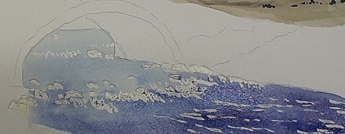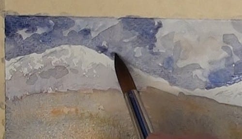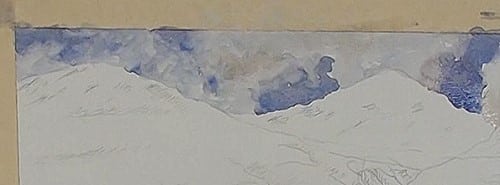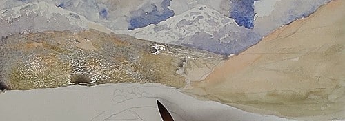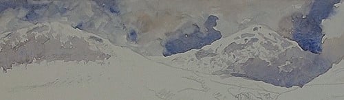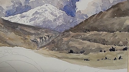 The furthest hills have snow on them so don't lose this effect by covering up too much of the white of the paper. Softer rendering of the sky colors are used here as a result of the sky reflecting off the snow. Carefully add the shadowed areas on the hills.