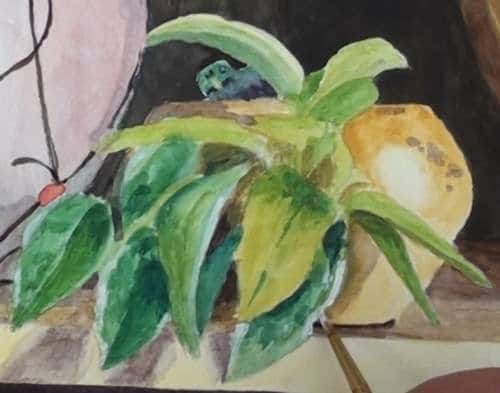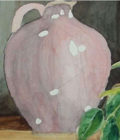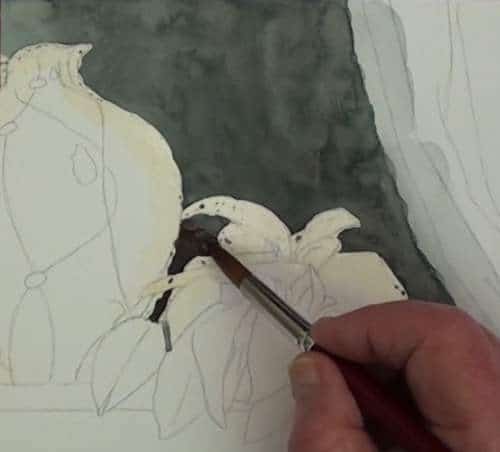 Remove the Masking fluid and start the small pot. Darken up the areas between the leaves and lift out the highlight area
