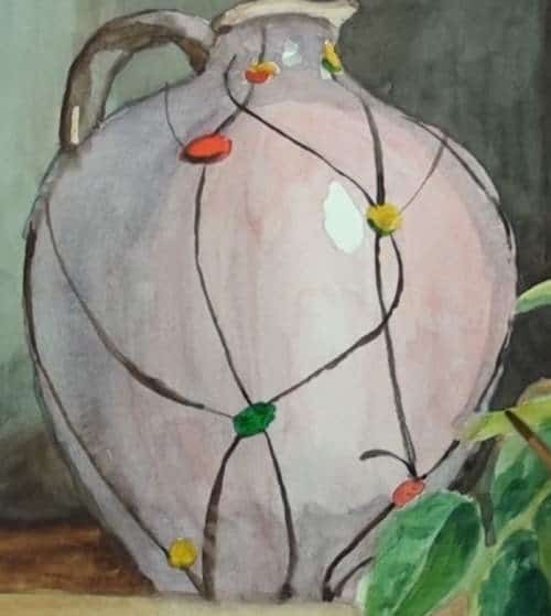 Add masking fluid to the string knots and when dry paint a Light Purple undercoat to the vase. Remember to dry each layer. Test each layer colour before applying. Keep each brush stroke in the form of the vase. Build up the shadow area on the left. Finally add a warmer layer over the bottom cooler layer. Dry and remove the masking fluid.