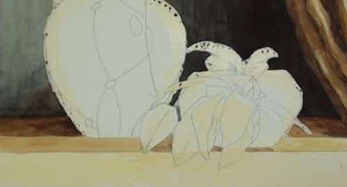 Mask in all the objects with masking fluid – keeping the edges neat and sharp Wet the background and float in a light gray mix. Then dry. We are using the glazing technique – layer over layer. Slowly build up until you reached the desired tonal range. Thoroughly dry each layer before adding the next.