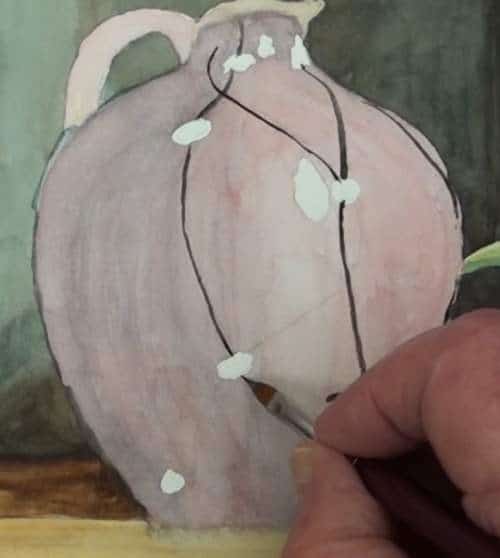 With the dark colour and a small round brush paint in the strings. Use varying widths. At the same time work on the lug of the vase. I have added a few extra strings for visual balance.