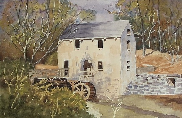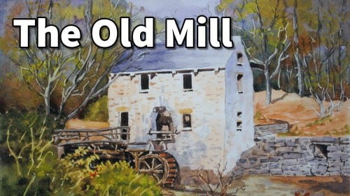 We can now complete the detail around the door and the railing of the small bridge. Tidy up the water wheel and add the small wall at the back of the building. Deepen up the shadows in the foreground and against the small wall. Now that the foreground is dry, we can add the small leafless tree and add the shadows to the wall blocks. Notice the different tonal ranges in the wall.