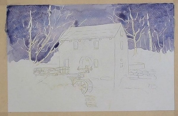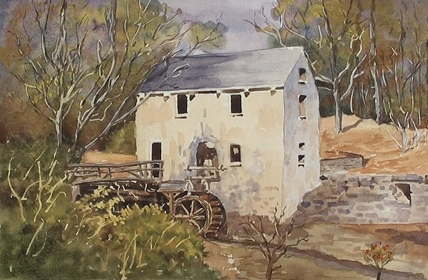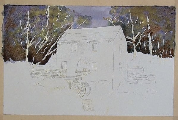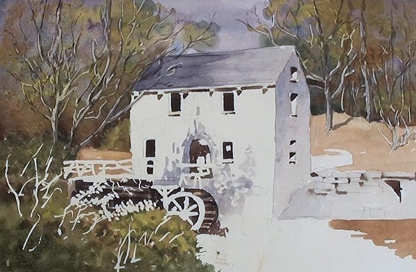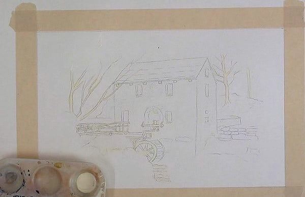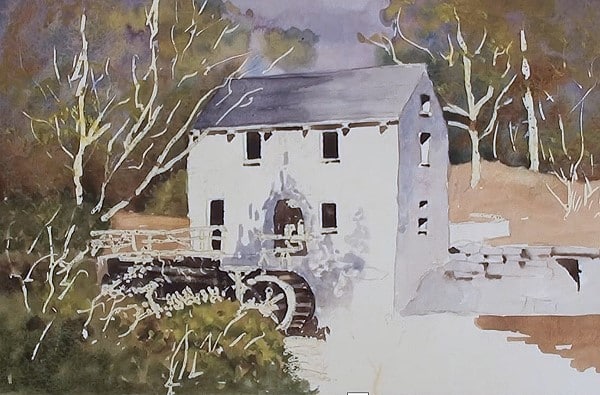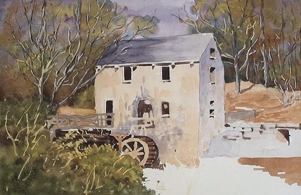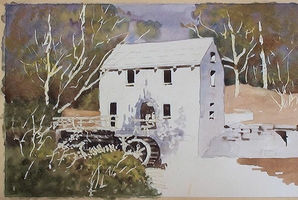Paint the background with light Burnt Sienna and drop in some green on the left side. Lift out the beams and at the water wheel.