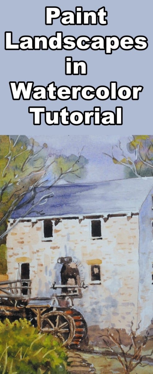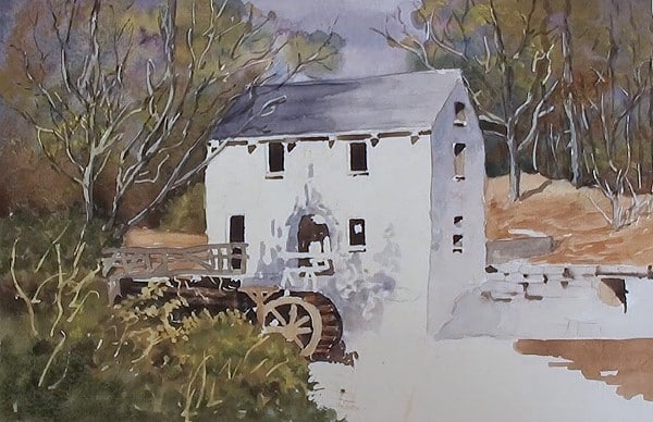 With a light blue/grey mix dab in the tree shadows on the wall and paint the shadow side of the mill. Notice that it gets slightly lighter towards the bottom due to the ground surface reflecting light upwards. It is also slightly darker along the edge of the building.