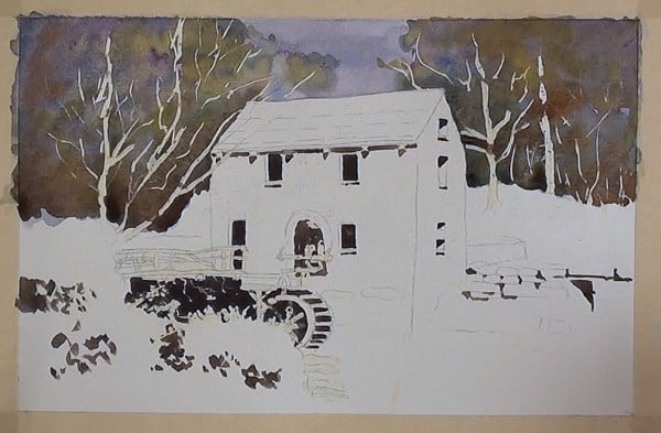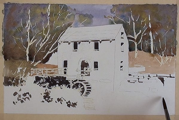 With masking fluid, mask off all the areas that need to be kept light.