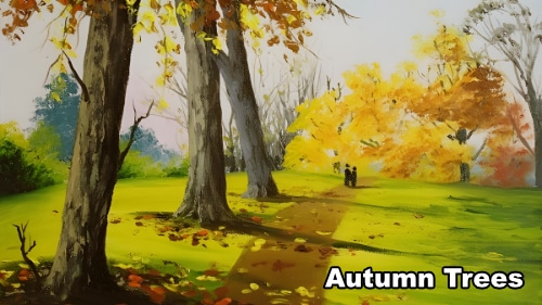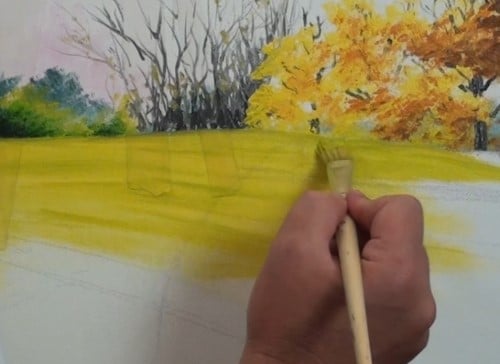 Prepare the colours you will need for the autumn trees – yellow, orange, and brownish tones.
