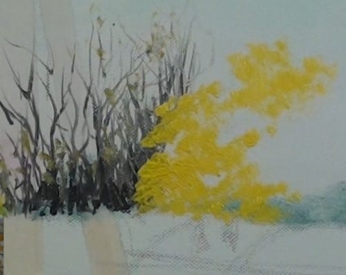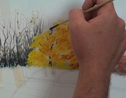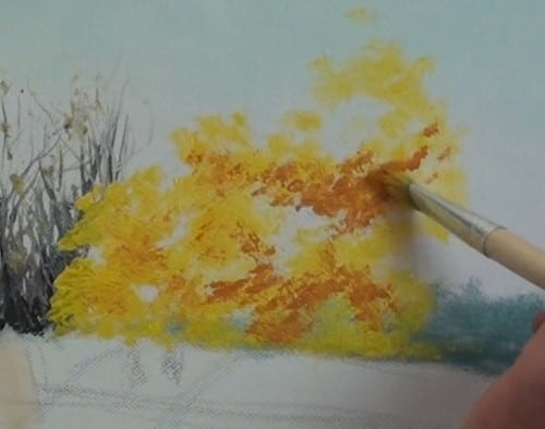 Begin with the yellow leaves on the left where the brightest light is. Note the tapping/stabbing brush technique that Nolan uses to apply the paint to create the look of leaves. Be sure to leave “sky holes.”