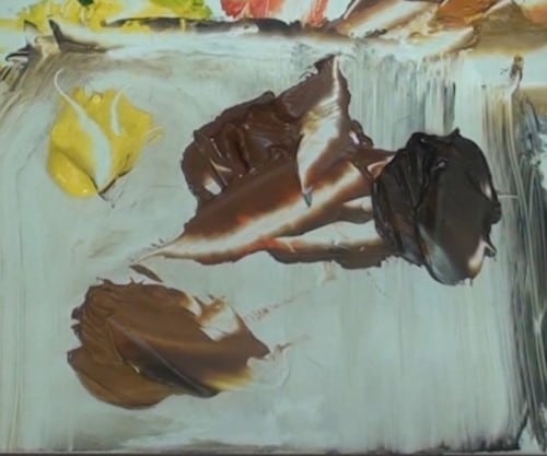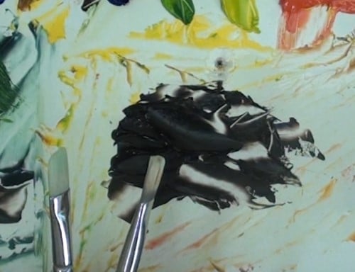 Mix the colours you will need to paint the leaves at the top of the main trees. Use the knife technique that Nolan employs. Note that the paint needs to be very thick at this point. Start with the yellow leaves, then move to the darker - coloured ones.