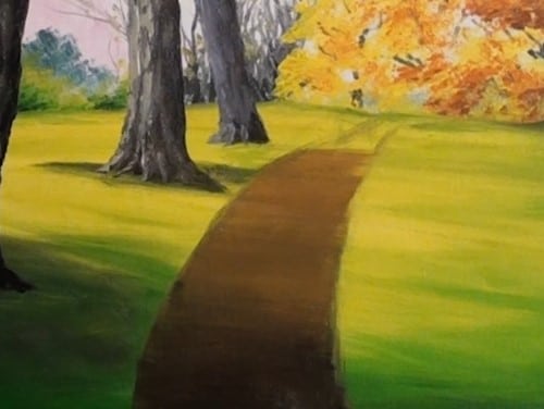 Use some dark shades to scrub on some colour of disturbed ground and dead leaves under the trees. Use darker tones to extend the shadows from the tree trunks across the path. Use the knife to scratch in the impression of other objects on the ground.