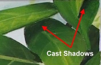 Overlapping leaves also cast shadows on the ones below them. Look for and paint in these shadows as they show the height between each leaf.