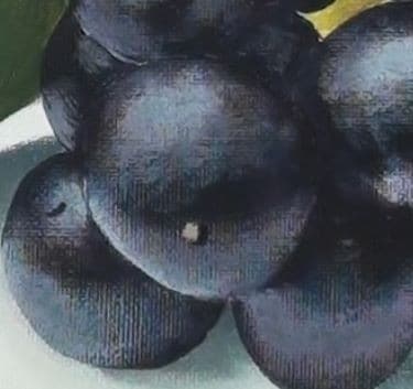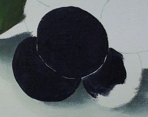 I then block them in using this mixture. As I do note how I leave the thinnest sliver of canvas showing where two berries meet.