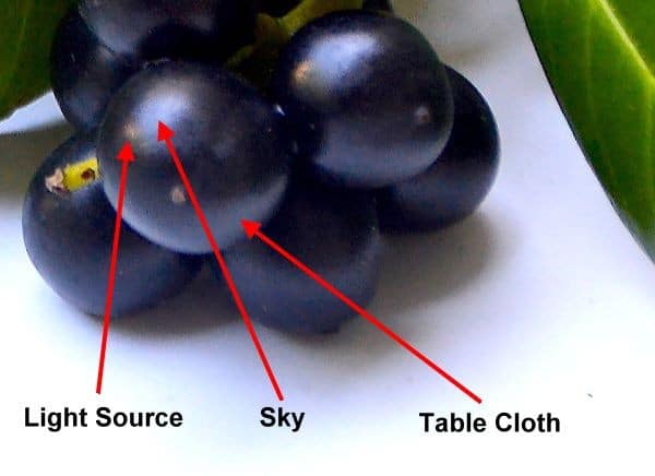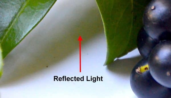 Some of the light is bouncing off the leaves and berries and discolouring our grey shadows.