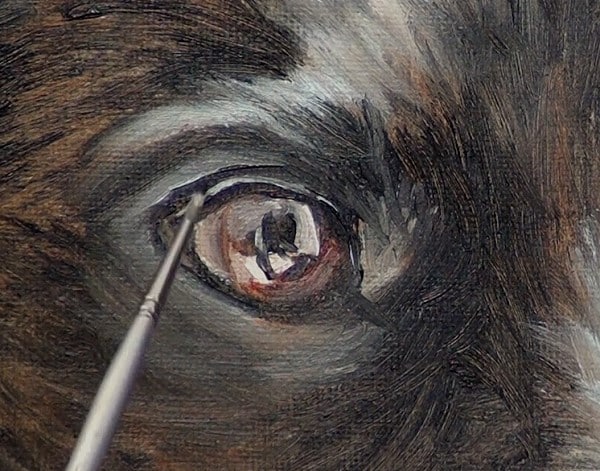 To paint the eye, ignore the reflections in the eye. Look past them to paint the eye as though there are no reflections first. Then come back to add the reflections in the eye.