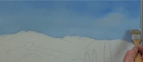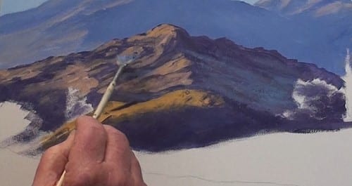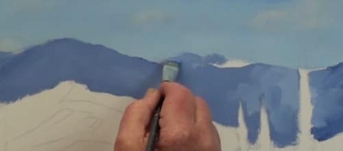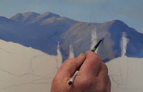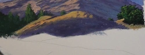 The foothills have more red in it than the distant mountain color. Notice that I have left some lighter patches as guides for the bright sunlit slopes.