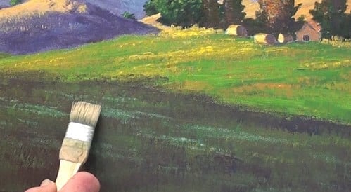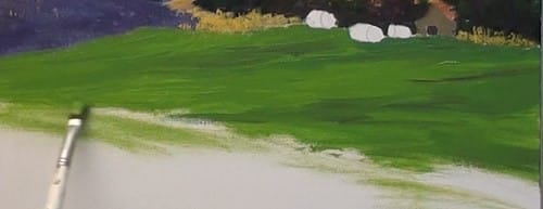 The underpainting to this field is a bright green. All the brush strokes must follow the slope of the ground. Now, with a small flat brush stroke in some dark lines to show the character of this field.