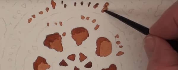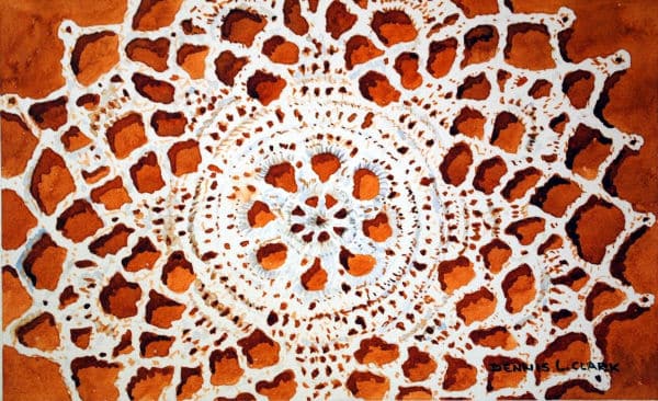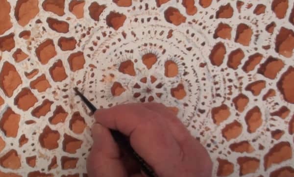 This piece of lace work is see-through, so it is necessary to mix up some of the table color, which in this case is Burnt Sienna. Some of the holes are large and some are very small, so it is important that you choose the right size brush for the hole in question.