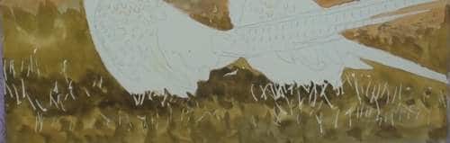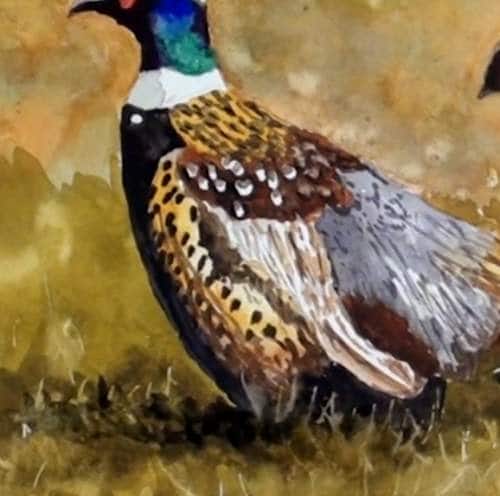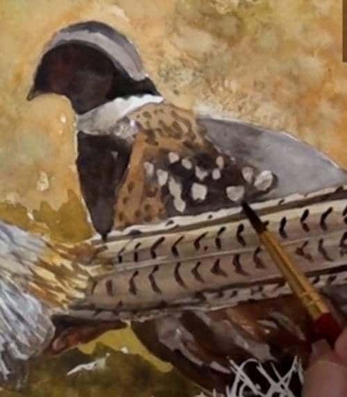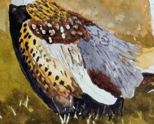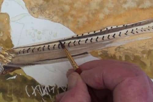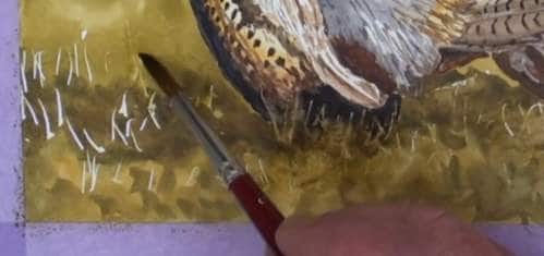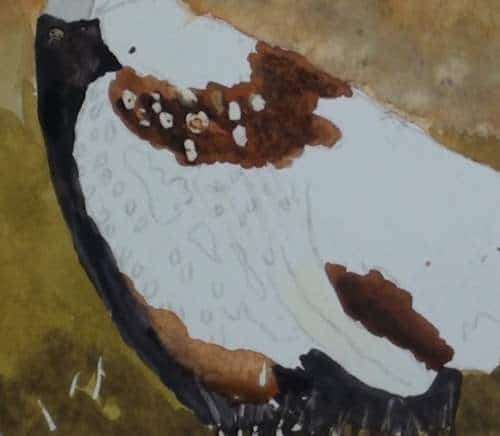 When painting the finer details, keep refering to the reference photograph. When adding the darker dots on the body you don't need to count every single one. Just getting them to look similar is all that is needed. Remove the masking fluid off the body, as well as in the grassy area.